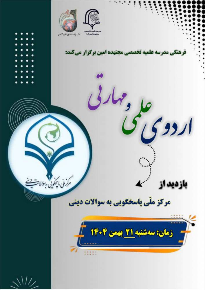 1404/11/21اردوی علمی مهارتی در قالب بازدید از مرکز ملی پاسخگویی به سوالات دینی با هدف آشنایی طلاب از حیطه کاری کارشناسان محترم این اداره همچنین ایجاد انگیزه در اینکه شرایط همواره برای حضور طلاب در عرصه های مختلف علمی پژوهشی و تبادل اطلاعات و کسب درامد فراهم است. این بازدید در تاریخ 21 بهمن ماه1404 ساعت11:15 بمدت 2 ساعت برگزار خواهد شد.