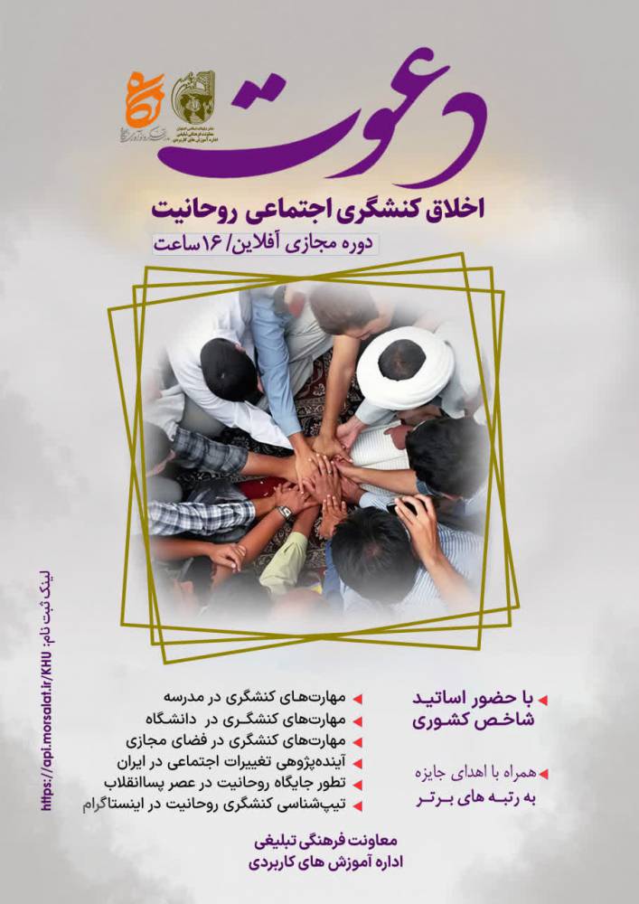 1404/09/30اخلاق کنشگری روحانیت در میدان اجتماع دوره مجازی آفلاین/ همراه با اهدای جایزه به رتبه های برتر 16 ساعت سرفصلها: 1.آیندهپژوهی تغییرات اجتماعی در ایران 2.تطور جایگاه روحانیت در عصر پساانقلاب 3.تیپشناسی کنشگری روحانیت در اینستاگرام 4.ارتباط مؤثر و مهارتهای کنشگری، در مدرسه 5.ارتباط مؤثر و مهارتهای کنشگری، در فضای مجازی 6.ارتباط مؤثر و مهارتهای کنشگری در میدان دانشگاه اساتید: محسن قنبریان/محمدرضا فلاح شیروانی/محمدرضا جوان آراسته/ حبیب رحیمپور ازغدی/ علی سرلک/ احمد کوهی/حسن بوسلیکی/محمد همایونفر/ علی مخدوم/ اداره آموزشهای کاربردی مبلغان با همکاری مدرسه تفکر و نوآوری نگاه