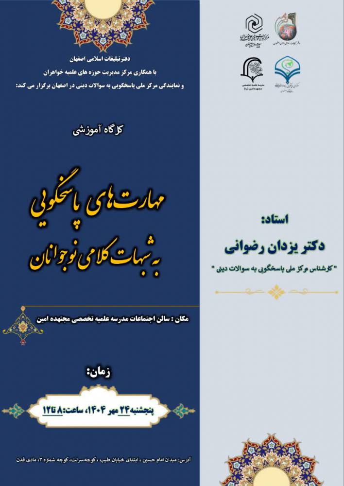 1404/07/23 - 13:00:00دوره آموزشی مهارتهای پاسخگویی با همکاری دفتر تبلیغات اسلامی،نمایندگی مرکز ملی پاسخگویی شعبه اصفهان،مدرسه تخصص مجتهده امین و مرکز مدیریت خواهران استان اصفهان طی یکماه هر هفته دو جلسه در محل مدرسه تخصصی مجتهده امین برگزار می شود این دوره به منظور تربیت مربیان پاسخگو در رشته های مشاوره،اخلاق،سیاسی،فقهی و کلامی می باشد.